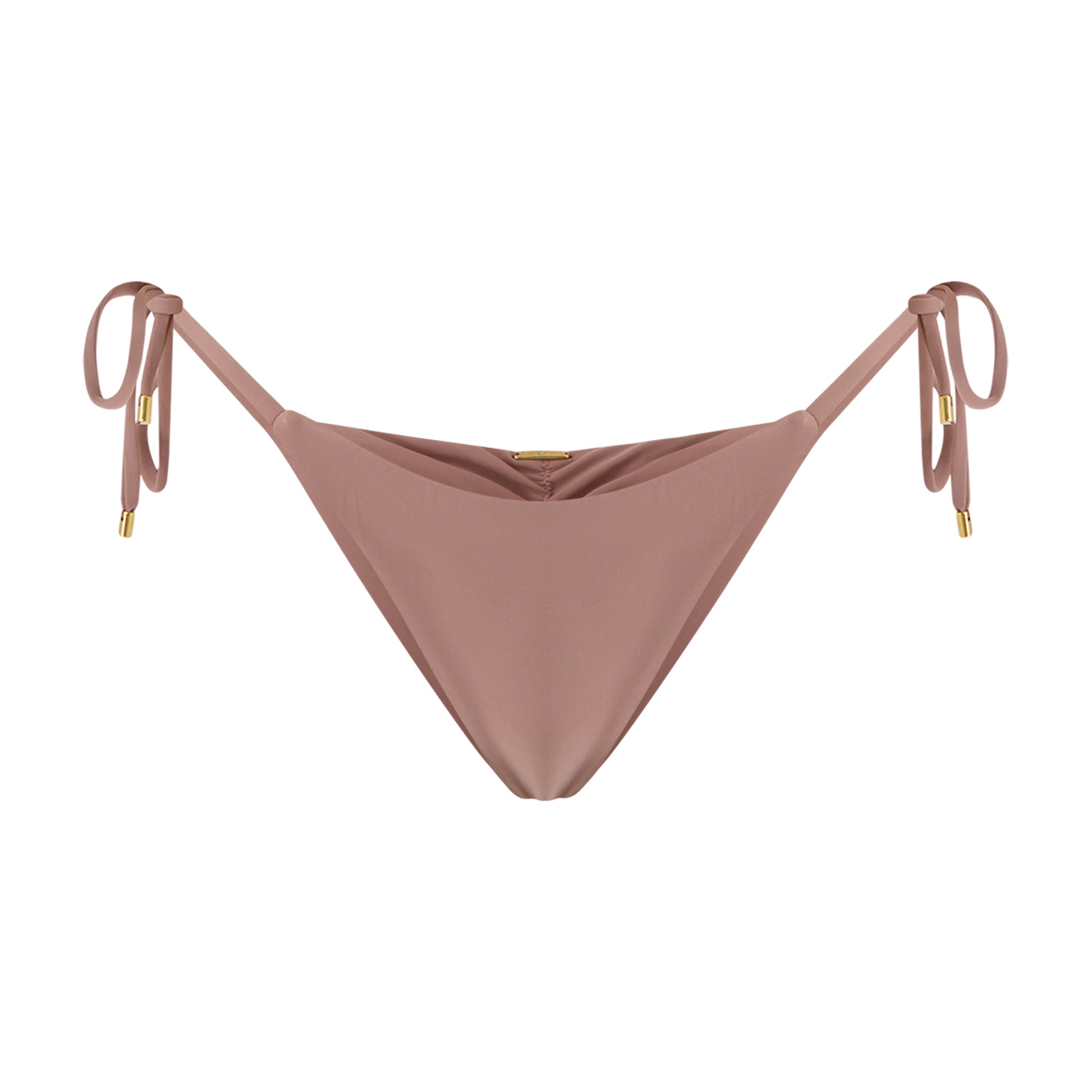 Designed to flatter every curve, this ruched tie-sided bikini bottom is adorned with charming gold hardware details on each tie and 24K gold dipped hardware and a genuine 1MM Colombian emerald for that extra touch of elegance.